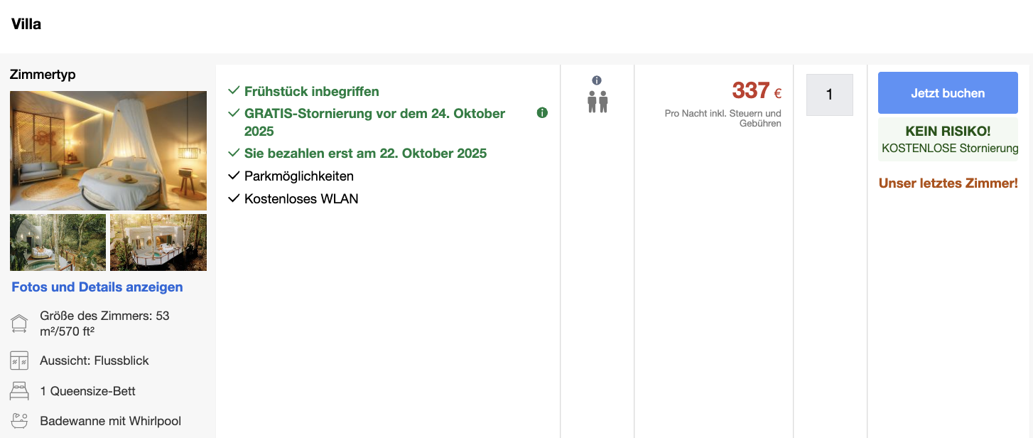 Am günstigsten ist die Villa aktuell bei agoda. Klickt euch dort durch die einzelnen verfügbaren Unterkunftskategorien, da es auch Villen ohne verschiebbares Bett gibt.