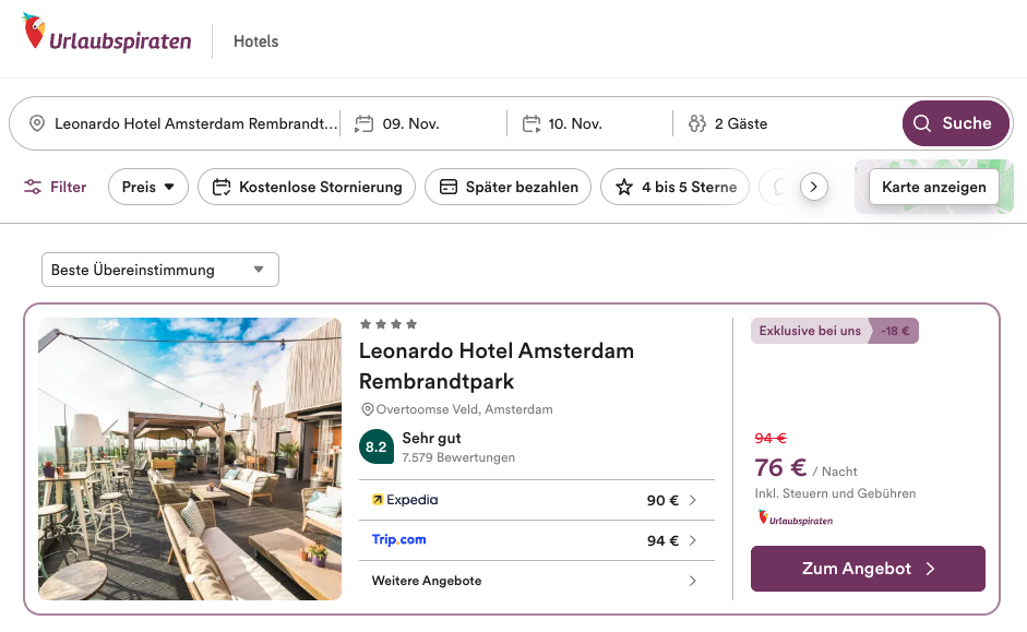 Für weniger als 40€ pro Person geht es ins 4* Leonardo Hotel Amsterdam Rembrandtpark. Genießt den Blick von der Rooftop Terrasse mit einer der besten Aussichten über die Stadt und entspannt nach einem langen Tag noch ein wenig in der Sauna. Das Frühstück gibt es gegen Aufpreis.