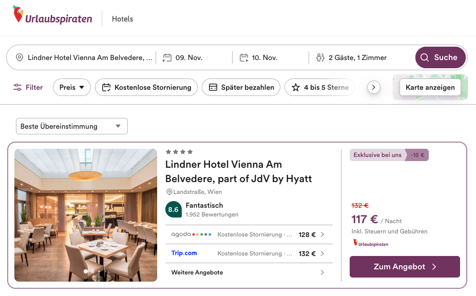 Und das passende Hotel? Liegt direkt nebenan! Das 4* Lindner Hotel Am Belvedere by Hyatt – top Lage, top Bewertungen und ein absoluter top Preis von gerade mal 58,50€ p.P. für die Nacht. Und das noch im Spätsommer! ☀️