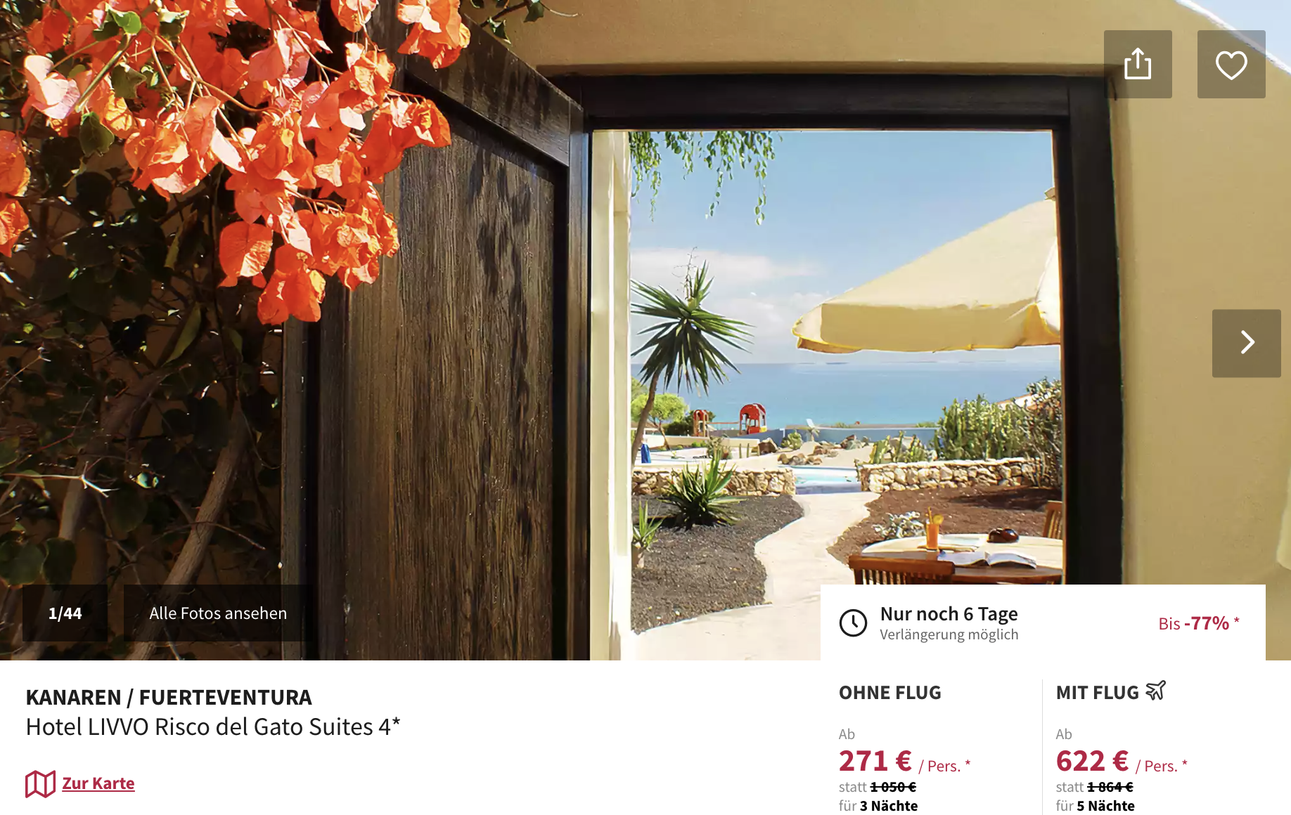 Wir haben uns bei diesem Beispiel explizit gegen das Angebot mit Flug entschieden, da ihr häufig die Flüge getrennt gebucht, weitaus günstiger bekommt und könnt somit nochmal enorm sparen könnt. Lasst euch einfach weiterleiten und checkt euer Wunschdatum aus.
