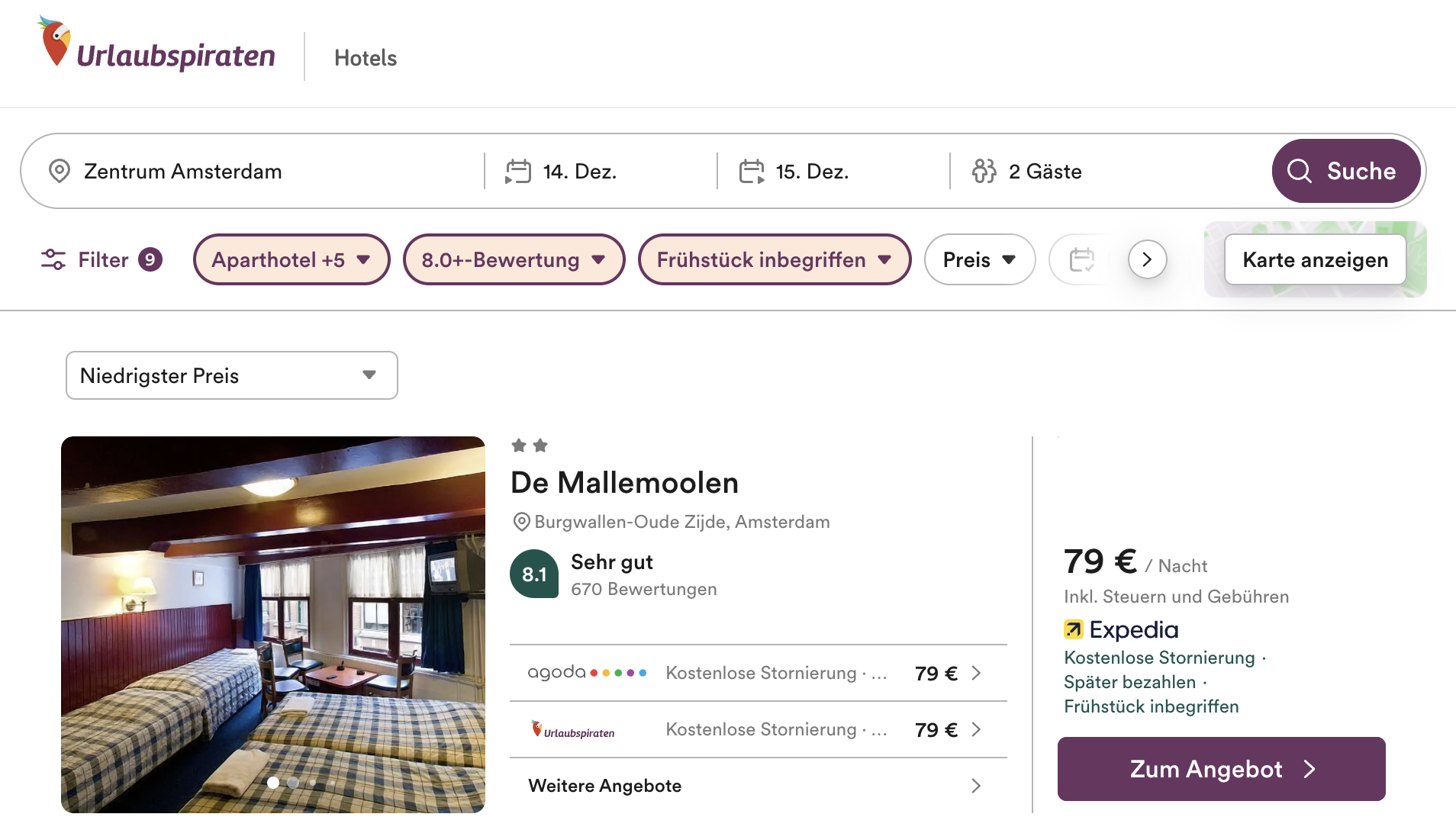 Klickt euch einfach mal durch die Suchergebnisse und schaut, welche Unterkunft für euch gut passt. Wir haben die Suche bereits auf das Stadtzentrum eingegrenzt, Hostels ausgeschlossen, das Frühstück inkludiert sowie nur Hotels mit einer Bewertung von mindestens 8.0 eingeschlossen. Ansonsten könnt ihr aber anhand der vielen Filtern die für euch passende Unterkunft finden. Wir möchten mit diesem Deal lediglich zeigen, wie günstig es möglich ist.