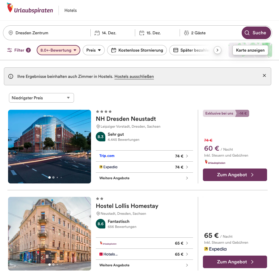 Klickt euch einfach mal durch die Suchergebnisse und schaut, welche Unterkunft für euch gut passt. Wir haben die Suche bereits auf das Stadtzentrum eingegrenzt sowie nur Hotels mit einer Bewertung von mindestens 8.0 eingeschlossen. Ansonsten könnt ihr aber anhand der vielen Filtern die für euch passende Unterkunft finden. Wir möchten mit diesem Deal lediglich zeigen, wie günstig es möglich ist.