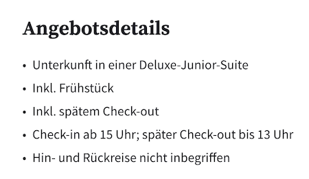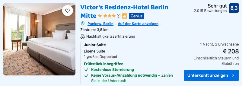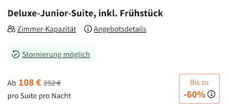 Woanders kostet der Beispieltermin vom 30.11. - 01.12. gleich mal 208€ in der regulären Junior Suite, mit diesem Deal hingegen nur 108€ gesamt und dann seid ihr in der Deluxe Junior Suite und bekommt noch den Late Check-out hinzu.