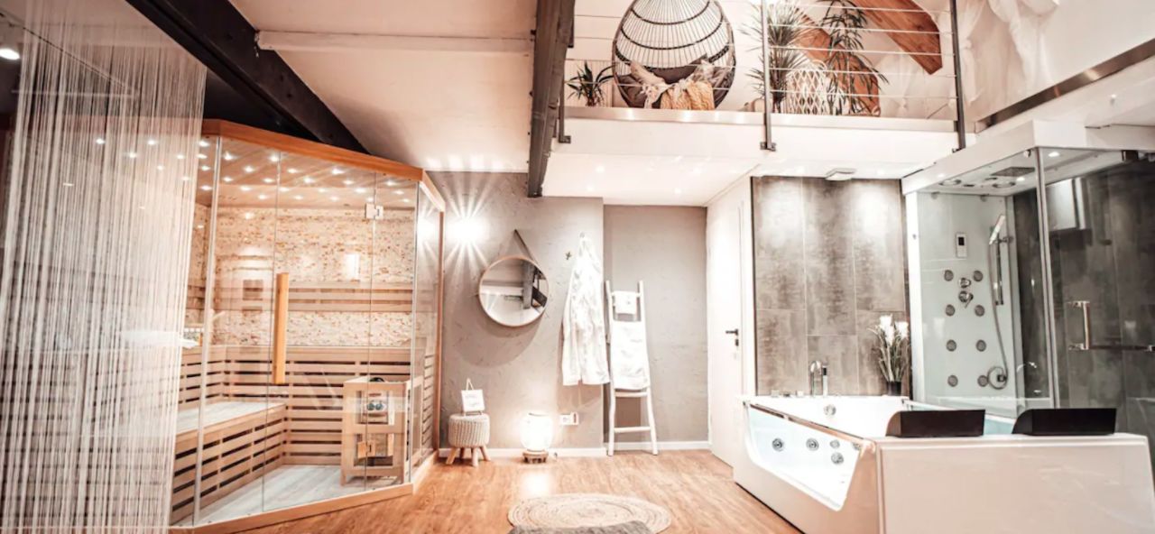 In Ralingen, in der Nähe von Trier, findet ihr dieses coole Designer-Loft mit eurem ganz eigenen Spa! Das zweistöckige Loft bietet euch dabei eine Sauna, einen großen Whirlpool und Ruheliegen. Zu der Unterkunft gehören außerdem eine moderne Küche, ein Bad mit Dusche, ein 33 qm großes, offenes Schlafzimmer, Hängesessel und sogar eine Schaukel?!