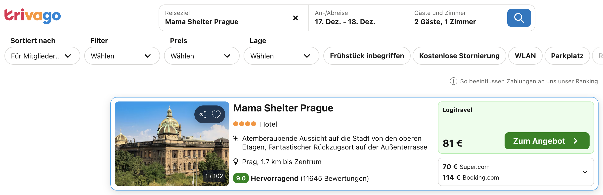 An unserem Beispieltermin konnten wir den günstigsten Preis bei "Super" finden. Hier bekommt ihr die Nacht in unserem Beispiel schon ab 58 € (der Preis fällt nochmal leicht, also nicht wie auf dem Screenshot angeben mit 62 €), also 29€ pro Person. Natürlich könnt ihr auch länger bleiben. Lasst euch einfach mal weiterleiten und checkt euer Wunschdatum aus.
