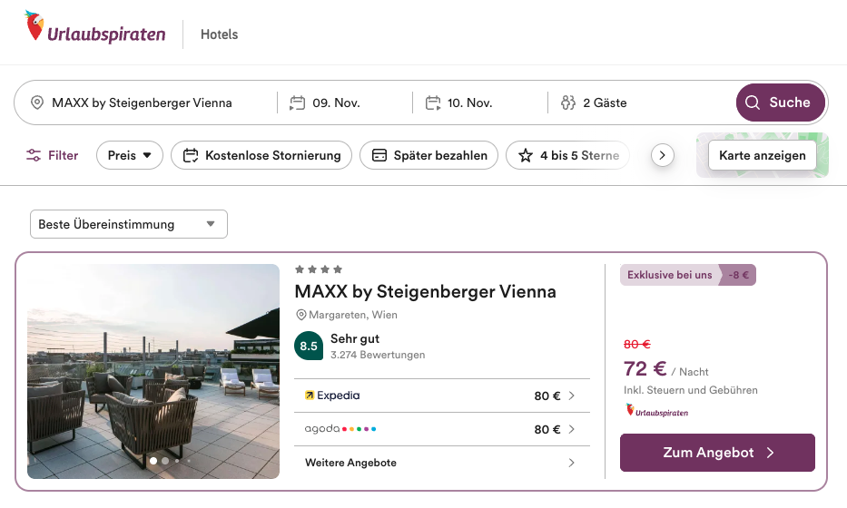 Es geht ins 4* MAXX by Steigenberger Vienna, das sich in zentraler Lage befindet und mit sehr guten Bewertungen punkten kann. Außerdem könnt ihr euch auf eine schöne Sonnenterrasse sowie einen Wellness- und Fitnessbereich freuen. Für eine Übernachtung zahlt ihr weniger als 40€ pro Person. Wie ihr unten seht, gibt es exklusiv bei uns den besten Preis!
