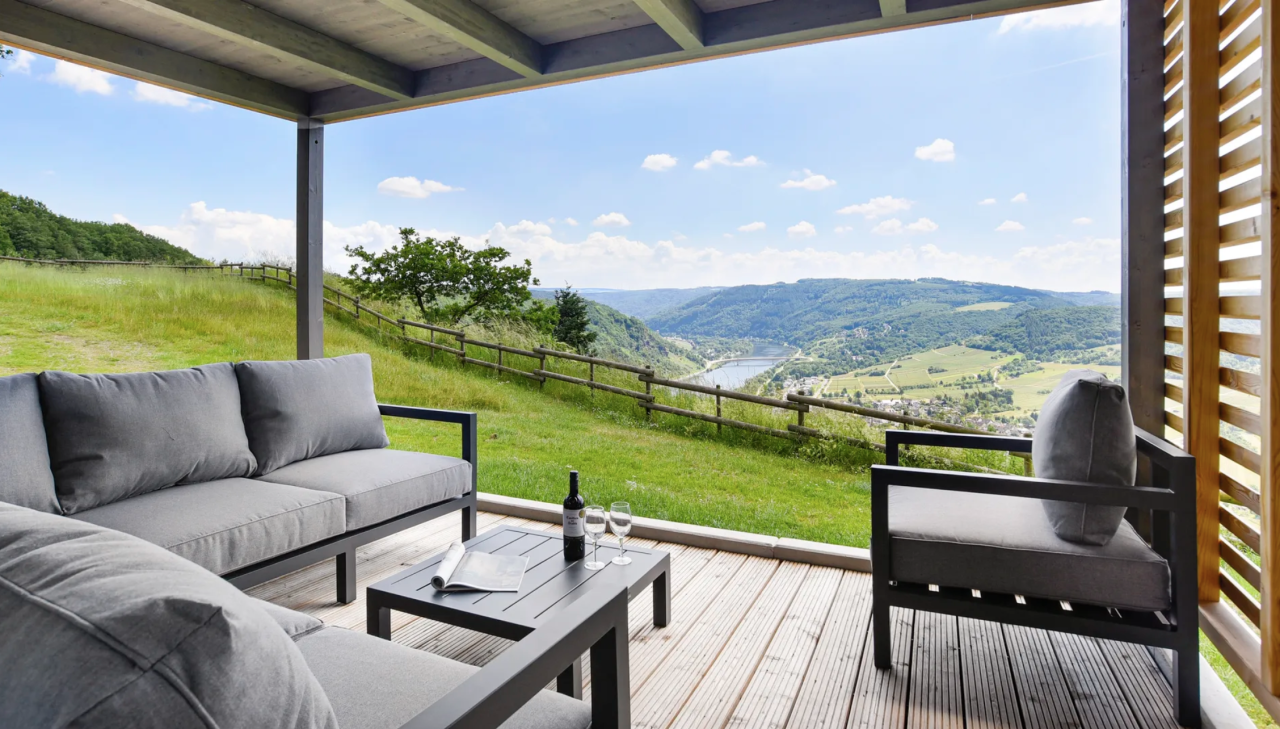 Ein Gläschen Wein und dazu dieser Ausblick – einfach traumhaft! Ob mit Freunden oder Familie – im Ferienpark Mont Royal verbringt ihr mit Sicherheit eine gute Zeit! Hier wird für Groß und Klein einiges geboten.