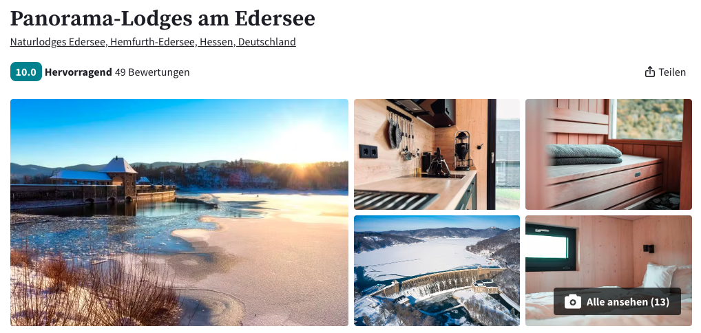 Die Naturlodges Edersee in Hessen öffneten erst im 2021 ihre Pforten und sind ein Traum für Naturliebhaber. Auch bei euch waren sie so beliebt, dass die Verfügbarkeiten schnell erschöpft waren. Das ist auch nicht verwunderlich, denn ihr kommt in eurer eigenen Lodge unter und habt sogar eine private Sauna mit am Start. Perfekt also auch in der kalten Jahreszeit! Zwei Übernachtungen bekommt ihr bereits ab 149€ pro Person bei einer Reise zu zweit. Wollt ihr mit Hund verreisen, seid ihr ab 189€ pro Person dabei.
