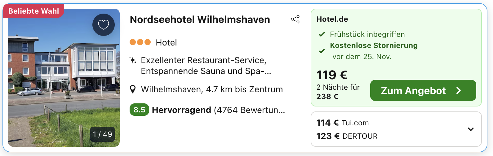Bei Travelpartner kostet euch ein Aufenthalt vom 28. bis 30. November inklusive Frühstück 111€ pro Person. Bucht ihr woanders, zahlt ihr 3€ mehr pro Person. Kurzum, mit dem Deal bekommt ihr den aktuell günstigsten Preis.