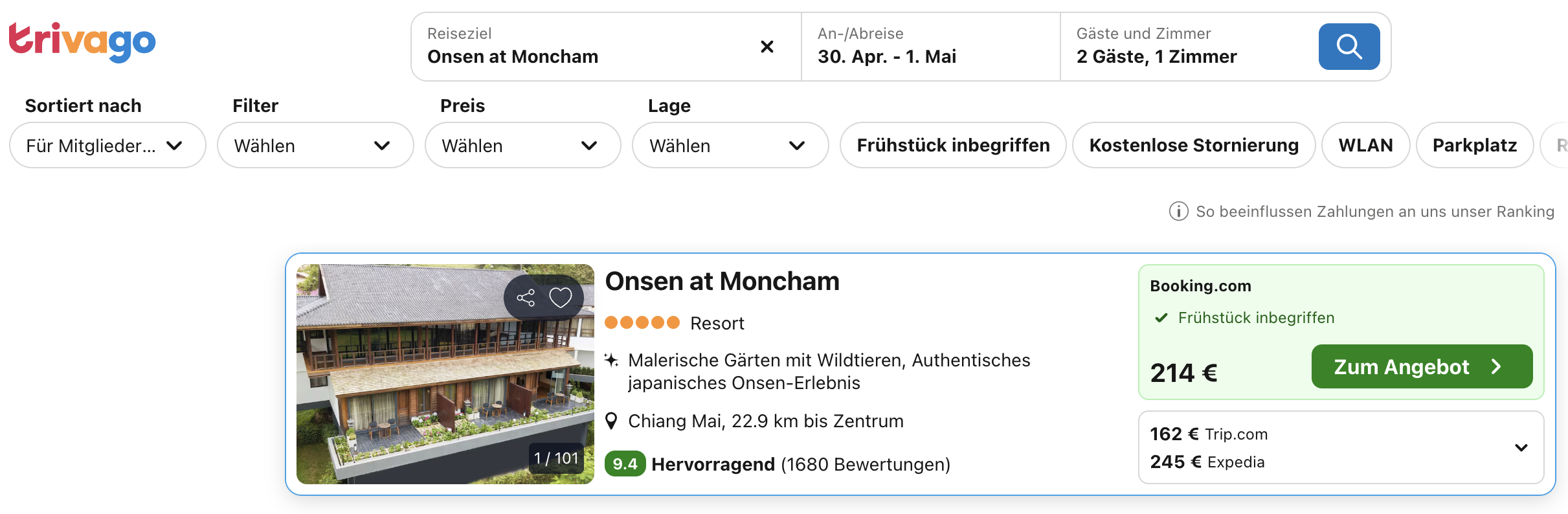 Den günstigsten Preis gibt es am Beispieldatum momentan bei Trip.com. Klickt auf "Trip.com" und lasst euch dann weiterleiten.