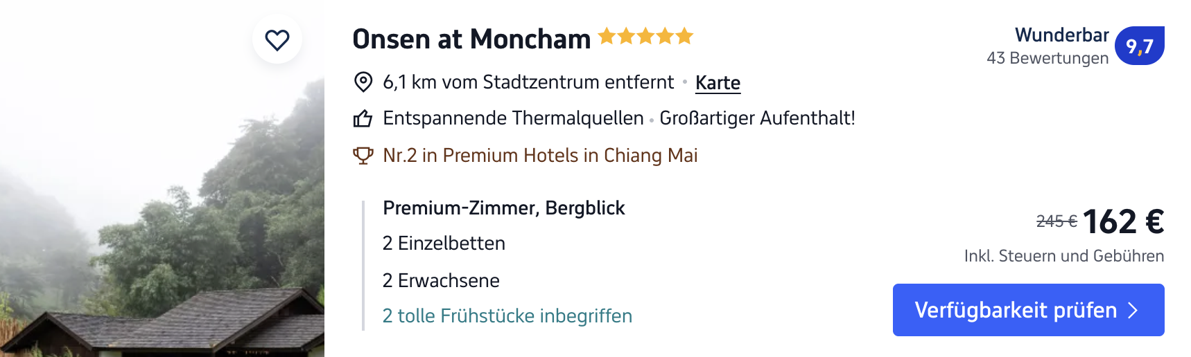 wie krass ist diese 5* Unterkunft denn 🤯 Ein japanisches Onsen in Thailand 🇹🇭🤔 Ja, das gibt es tatsächlich! Und zwar schon ab nur 81 € p.P. pro Nacht inkl. Frühstück! Das Resort ist wirklich traumhaft schön, lasst euch unbedingt mal weiterleiten und checkt die Fotos aus!
