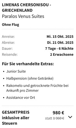 Für 1 Woche zum Ende der Saison (an unserem Beispieltermin sogar in den Herbstferien) zahlt ihr hier für die Junior Suite mit Halbpension gerade mal 490€ pro Person.