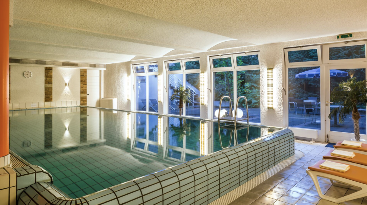 Das 4* Parkhotel Nümbrecht befindet sich im gleichnamigen Ort im Bergischen Land. Vor Ort erwarten euch hell eingerichtete Doppelzimmer. Entspannen könnt ihr beim Bahnen schwimmen im hoteleigenen Hallenbad oder in der Sauna. Außerdem steht euch ein Fitnessbereich zur Verfügung.