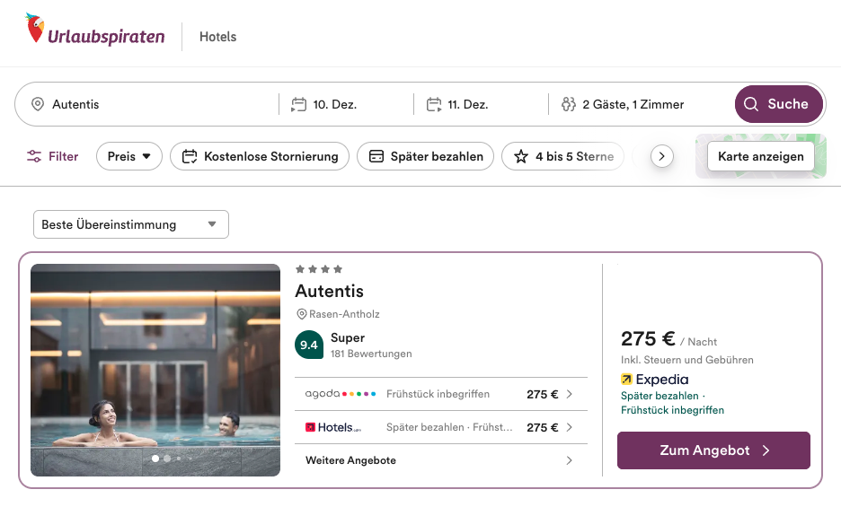 Wir haben uns einmal umgesehen und ein top bewertetes 4* Hotel in Seenähe mit einem tollen Wellnessbereich entdeckt: erst wandern, dann entspannen! Inklusive Frühstück kostet euch hier die Nacht 275€ bzw. 137,50€ pro Person bei einer Reise zu zweit.