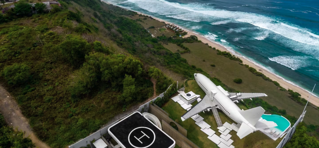 Auf Bali wurde das ultimative High Class-Erlebnis geschaffen: Die weltweit erste Private Jet Luxus-Villa, welche aus einem Flugzeug erbaut wurde und sich auf einer Klippe auf einer Höhe von 150 Metern über dem Meeresspiegel befindet. Von hier aus genießt ihr einen 180°-Blick auf Balis malerischen Nyang Beach.