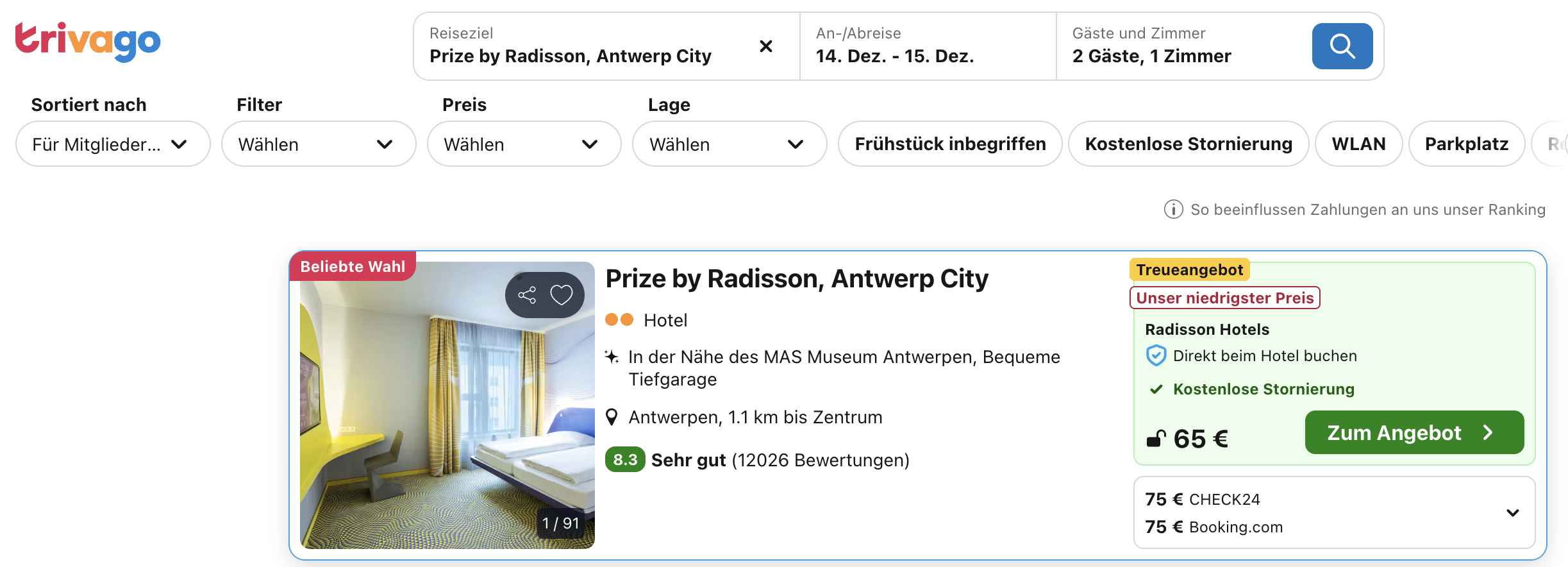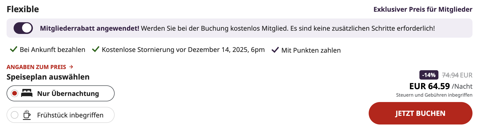An unsrem Beispieltermin konnten wir den besten Preis direkt auf der Hotelwebsite (Radisson Hotels) finden. Denn dort sinkt der Preis nochmal um 14%, wenn ihr euch schnell kostenlos & unverbindlich mit eurer E-Mail-Adresse anmeldet (Mitglied -14%). Lasst euch also einfach zu Radisson Hotels weiterleiten.
