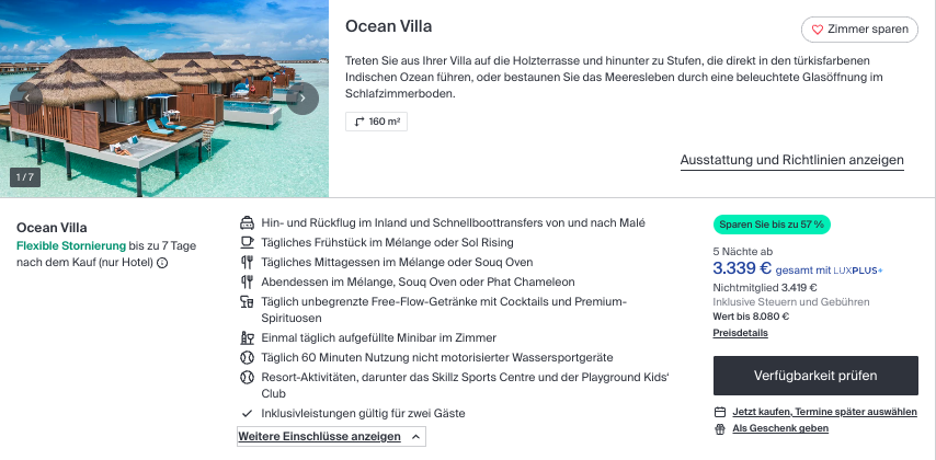 Buchst du die Flüge nun aber separat kosten euch diese 1.298€ (inklusive Gepäck), zum Beispiel mit Qatar Airways. Das Hotel aus diesem Deal kostet 3.419€, das macht am Ende 4.717€ bzw. 2.358,50€ p.P. bei einer klassischen Reise zu zweit, wodurch du gegenüber der Pauschalreise über 592,50€ p.P. sparst, bzw. 1.185€ bei einer klassischen Reise zu zweit 💰