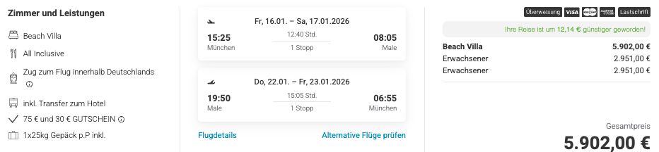 Bei diesem Angebot sind keine Flüge nach Malé enthalten.