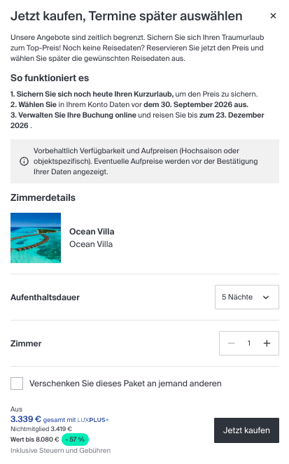 du kannst dir dieses Angebot auch schon heute zu diesem Preis sichern, selbst wenn du noch nicht genau weisst wann du reisen möchtest