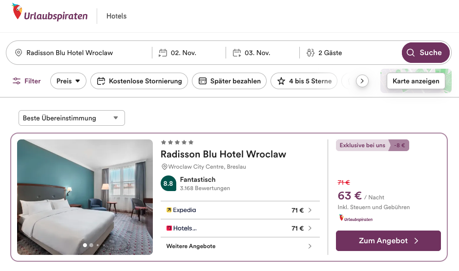 Mein Unterkunftstipp ist das top 5* Radisson Blu Hotel, Wroclaw. Für eine Übernachtung zum Beispiel im Herbst zahlt ihr nur um die 30€ pro Person bei der Reise zu zweit. Gegen Aufpreis bekommt ihr auch das Frühstück dazu. Wie ihr unten seht, bekommt ihr exklusiv bei uns den besten Preis.