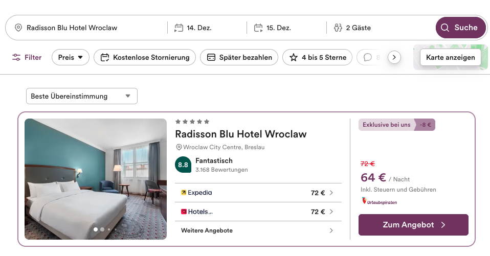 Mein Unterkunftstipp ist das top 5* Radisson Blu Hotel, Wroclaw. Für eine Übernachtung zum Beispiel im Advent zahlt ihr nur um die 30€ pro Person bei der Reise zu zweit. Gegen Aufpreis bekommt ihr auch das Frühstück dazu. Wie ihr unten seht, bekommt ihr exklusiv bei uns den besten Preis.