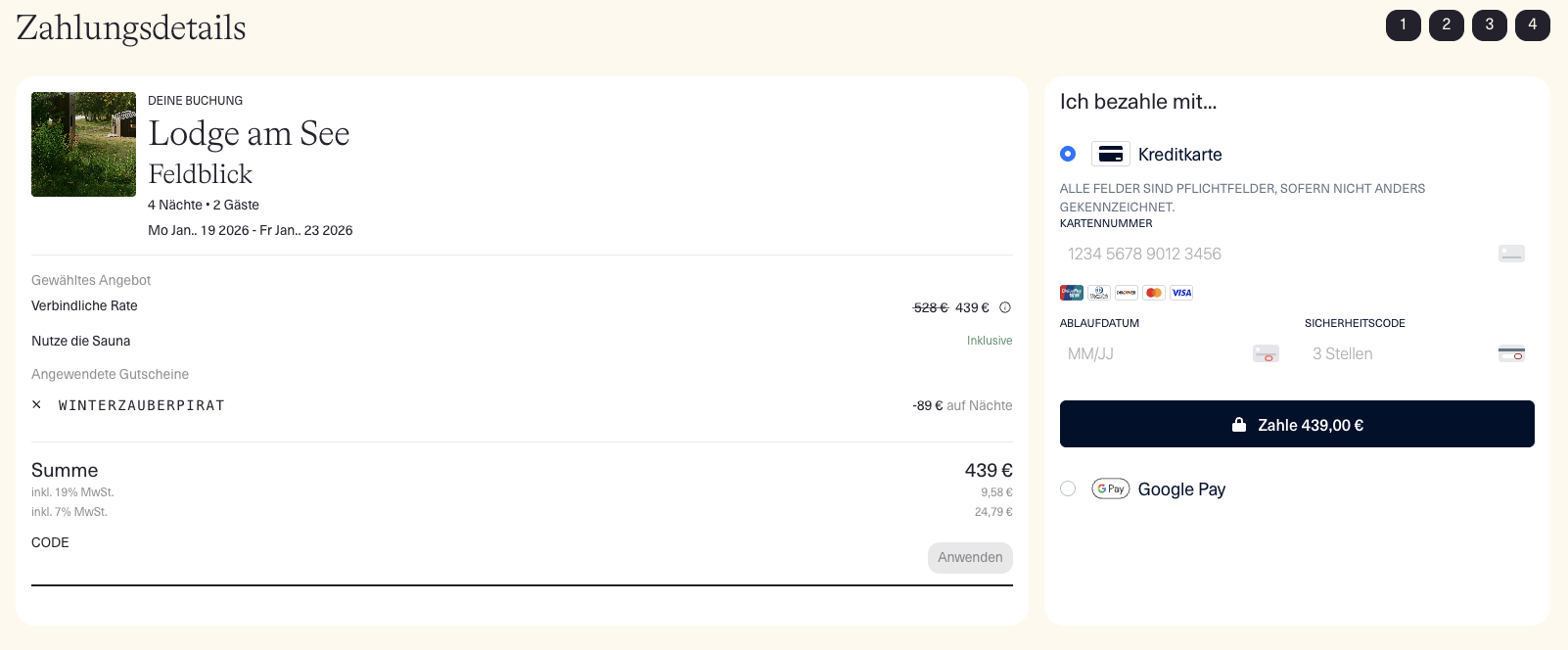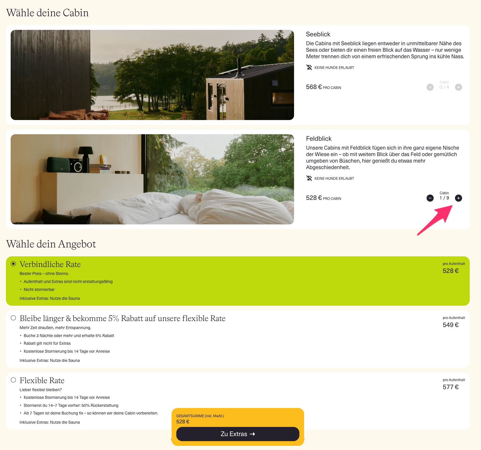 👉 Klickt auf die Lodge am See, wählt das Datum und anschließend ein Cabin (Feldblick) mit "+" aus und klickt auf die vergünstigte Rate: