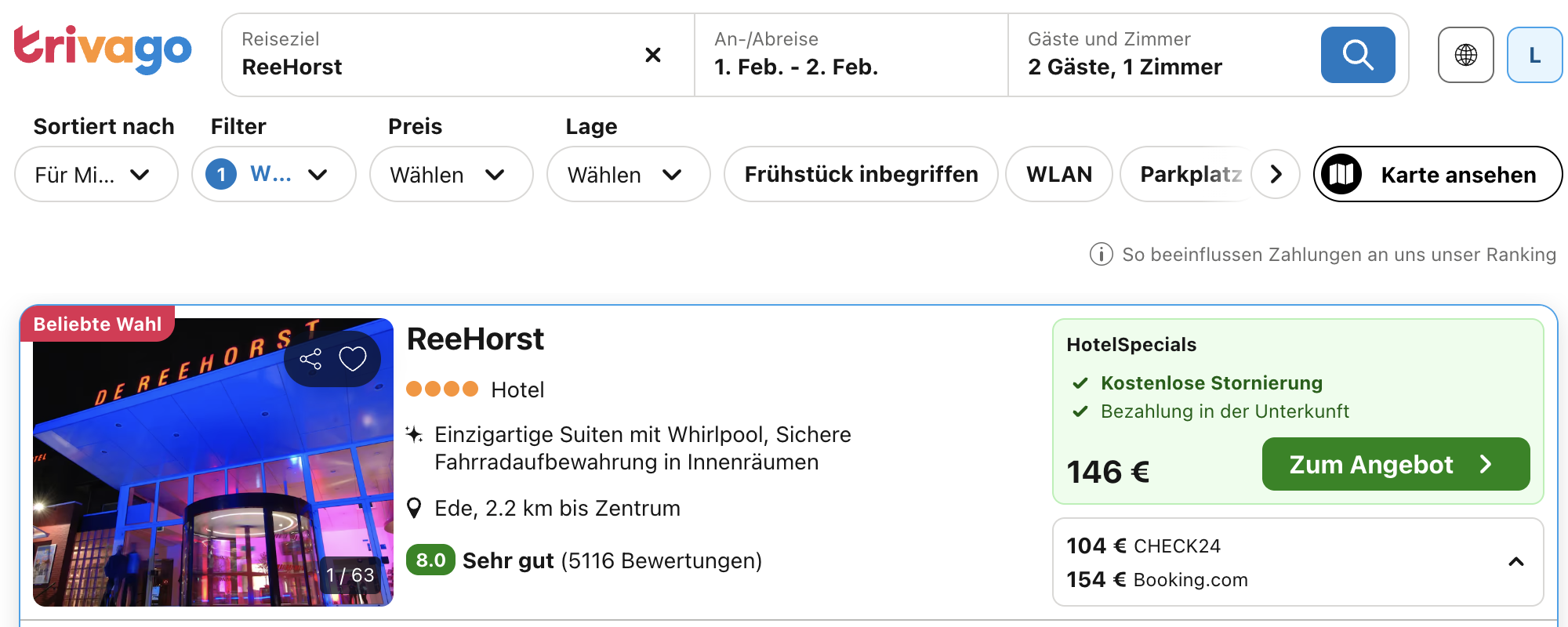 An unsrem Beispieltermin konnten wir den günstigsten Preis mit Verfügbarkeiten für die Whirlpool-Suiten bei CHECK24. com finden. Lasst euch also von Trivago direkt dorthin weiterleiten.