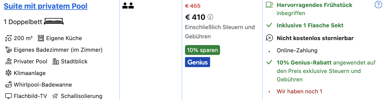 Den Bestpreis gibt's noch an einigen Terminen im November. Um die Suite mit privatem Pool zu finden, lasst ihr euch zunächst bei Booking zum Hotel weiterleiten, scrollt bis nach ganz unten, wo die Zimmer aufgelistet sind und wählt dann "Suite mit privatem Pool" aus. Beachtet, dass diese Suite an einigen Terminen schon ausgebucht ist. In dem Fall wird sie euch dann gar nicht angezeigt an dem Termin.