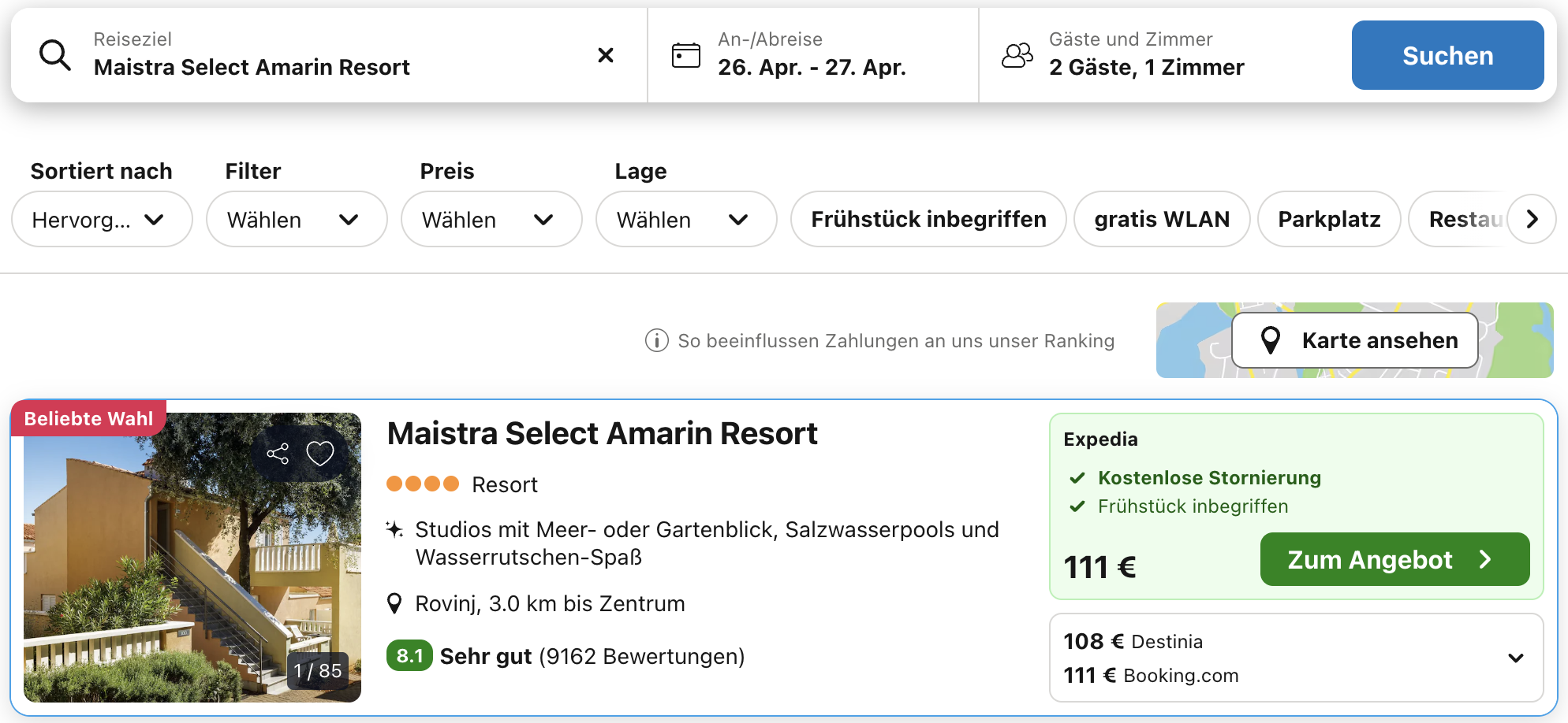 ℹ️ Beachtet, dass in diesem Deal noch keine Anreise inkludiert ist. Der nächste Flughafen ist Flughafen Pula, wo ihr bereits ab 120€ Return hinfliegt.