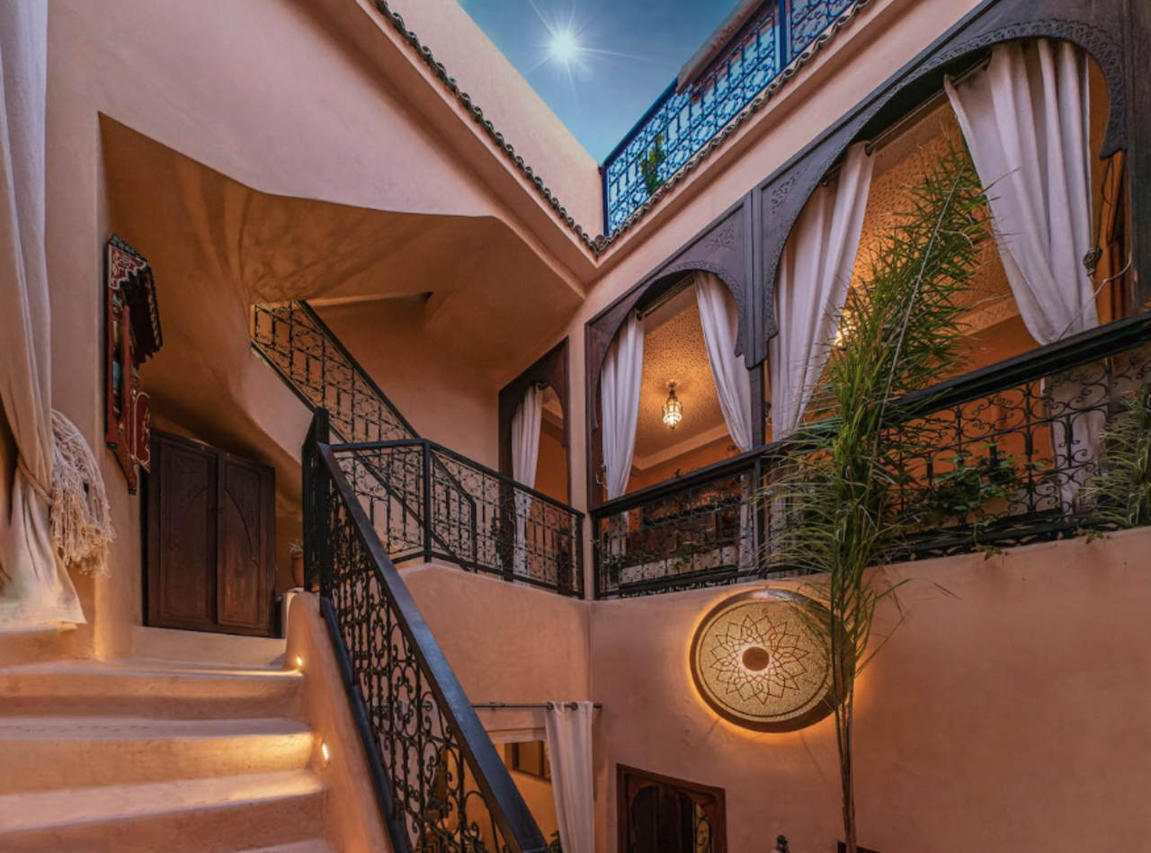 Das Riad befindet sich in Mouassine, nur wenige Schritte vom Jemaa el Fna Platz, dem zentralen Marktplatz der Stadt, entfernt. Im Riad selbst bekommt ihr von dem Trubel jedoch vermutlich weitaus weniger mit. Das Haus zählt zwei Schlafzimmer mit eigenen Bädern, ein Wohnzimmer und eine Küche. Im Erdgeschoss des Airbnb gibt es eine Terrasse, darüber erwartet euch eine weitere Terrasse mit Sitzmöglichkeiten. Insgesamt finden bis zu 4 Erwachsene und 3 Kinder in dem Riad Platz.