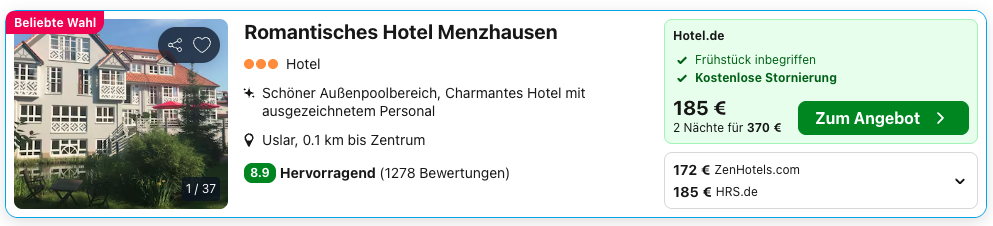 Woanders kostet der Beispieltermin (23. - 25. November) gleich mal mindestens 172€ pro Person nur mit Frühstück, bei Travelcircus zahlt ihr nur 99€ pro Person und habt noch das Abendessen am Anreisetag mit dabei. Ihr spart also weit mehr als 42%!