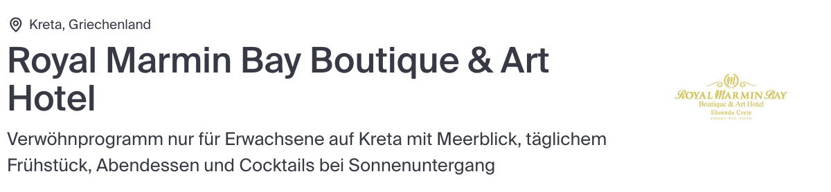 Wenn du nach einem Ort suchst, der sich wie ein kleines, elegantes Geheimnis anfühlt, dann ist das Royal Marmin Bay Boutique & Art Hotel genau dein Spot. Dieses Adults-Only-Juwel an der Mirabello-Bucht kombiniert luxuriöses Boutique-Design mit absoluter Ruhe - perfekt, um einmal komplett abzuschalten und dich einfach treiben zu lassen.