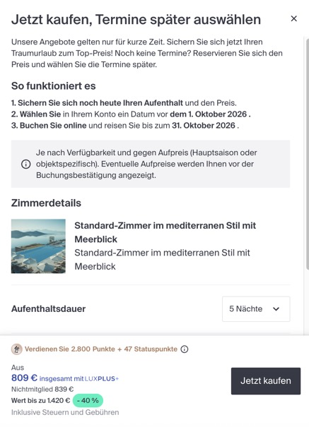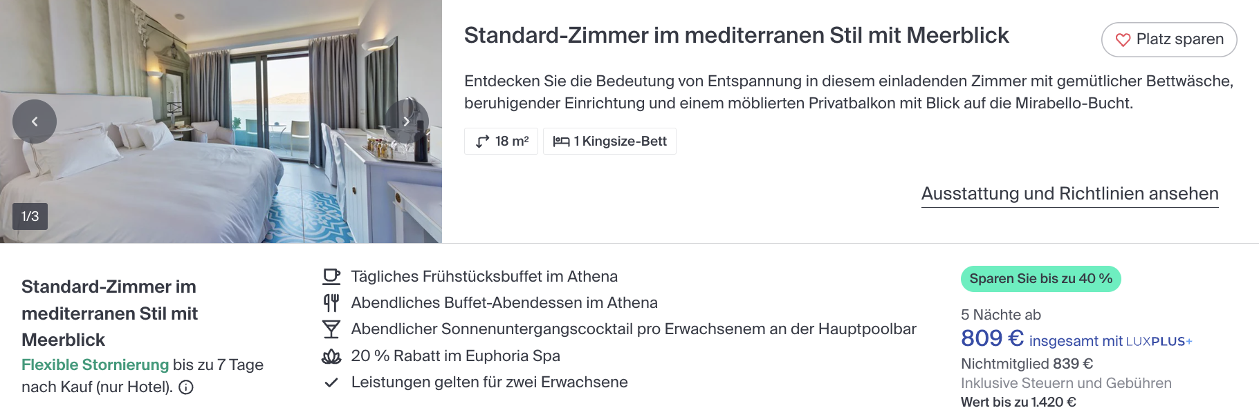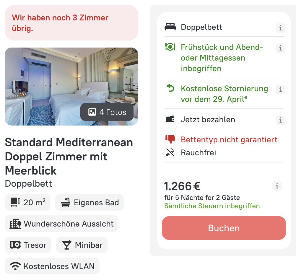 Bei anderen Buchungsportalen zahlt man in dem Zeitraum aktuell mind. 1.266€ bzw. 633 Euro pro Person für die gleiche Zimmerkategorie einschließlich Frühstück und Abendessen.