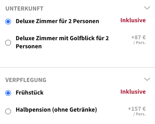 Upgrades? Für recht wenig Aufpreis könnt ihr eure Zimmer upgraden oder direkt die Halbpension dazu buchen: