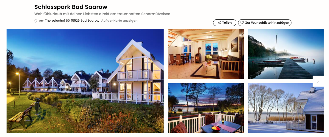 Im Schlosspark Bad Saarow, rund 80km entfernt vom Zentrum Berlins, findet ihr Ferienhäuser für 4 bzw. 6 Personen mit privater Sauna und Whirlwanne. Reist ihr zu viert, könnt ihr euch jetzt vier Nächte für nur 99€ pro Person sichern!