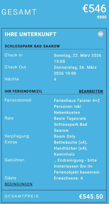 Der Basispreis gilt immer für 4 Personen. Beim Hinzubuchen von Kindern bis einschließlich 17 Jahre fällt eine Gebühr von 25€/Nacht an