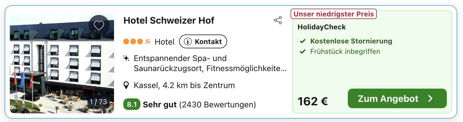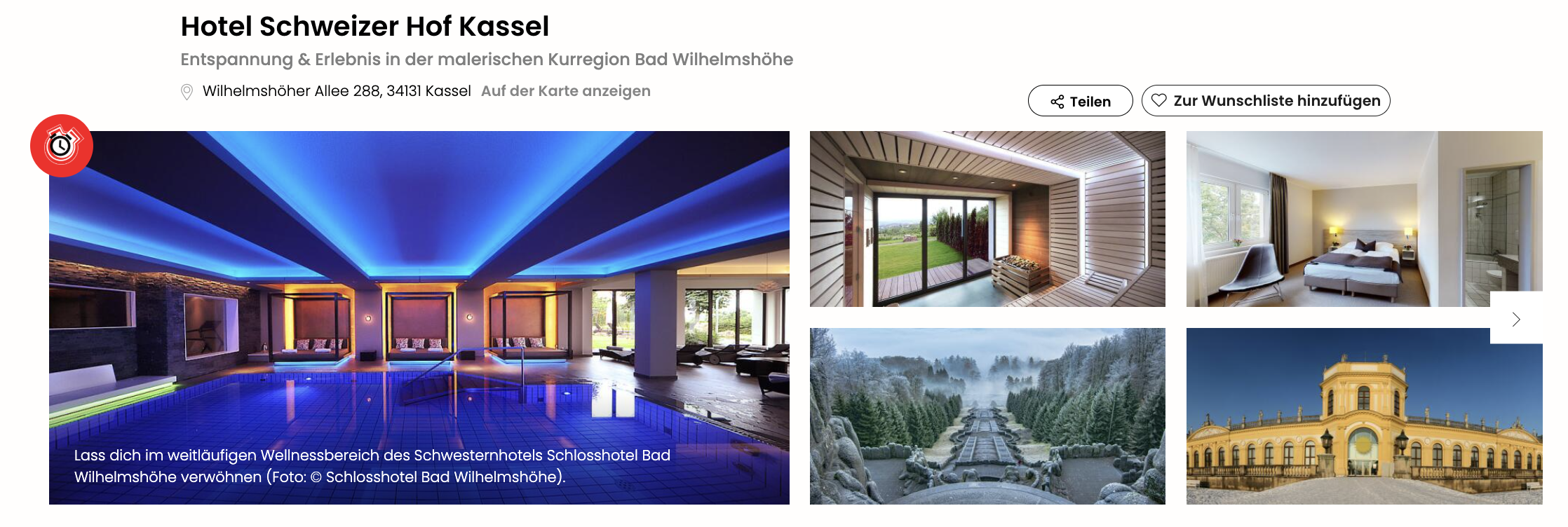 Mit diesem Deal haben wir eine günstige Alternative, bei der ihr ebenfalls in den Genuss eines toll ausgestatteten Spa-Bereichs kommt: Eine Übernachtung im Hotel Schweizer Hof in Kassel kosten euch mit Frühstück 🥐 nämlich nur 29,50€ pro Person. Im Hotel selbst erwarten euch wohl "nur" eine Sauna, eine Infrarotkabine und ein Ruheraum, doch ihr könnt je nach Reisezeitraum zusätzlich den 800 m² Wellnessbereich des Schwesterhotels nutzen und der lässt keine Wünsche offen: Innenpool 💦 und Naturbadeteich, Saunalandschaft und Fitnessraum 🤩