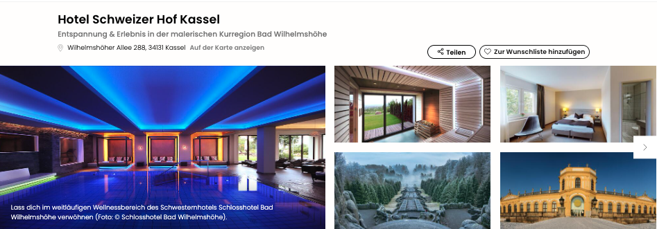 Mit diesem Deal haben wir eine preisgünstige Alternative, bei der ihr ebenfalls in den Genuss eines toll ausgestatteten Spa-Bereichs kommt: Zwei Nächte im Hotel Schweizer Hof in Kassel kosten euch inkl. Frühstück 🥐 nämlich nur 59€ pro Person. Im Hotel selbst erwarten euch wohl "nur" eine Sauna, eine Infrarotkabine und ein Ruheraum, doch ihr könnt je nach Reisezeitraum zusätzlich den 1.000 m² Wellnessbereich des Schwesterhotels nutzen und der lässt keine Wünsche offen: Innenpool 💦 und Naturbadeteich, Saunalandschaft und Fitnessraum 🤩