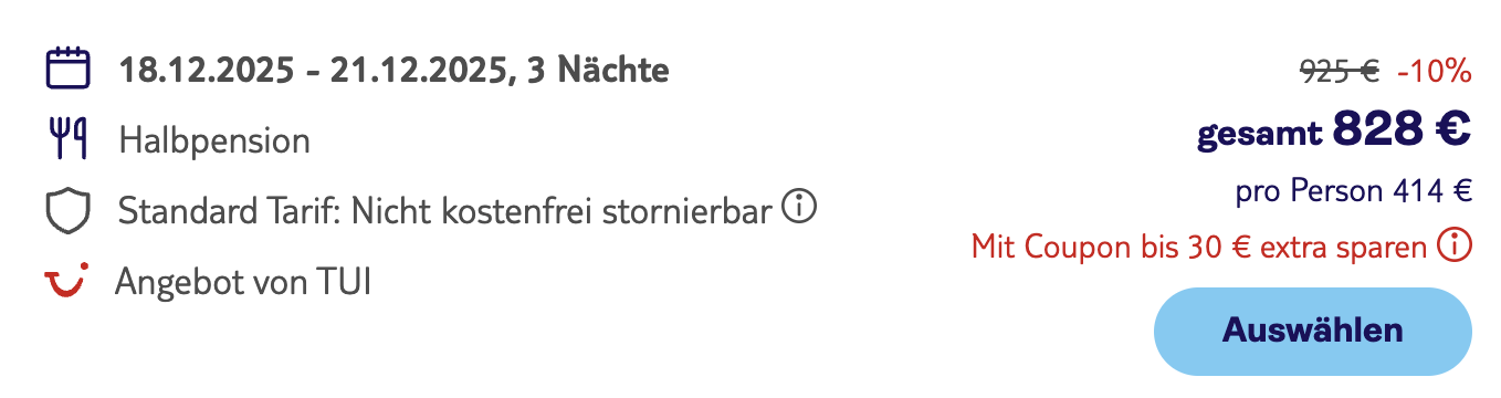 Wir durften für euch die Preise vergleichen und haben im Zeitraum vom 18.12. bis 21.12. bei diesem Deal einen Preis von 99€ pro Person. Bei TUI beispielsweise müsstet ihr für das Hotel in dem Zeitraum 414€ pro Person zahlen. Das macht eine Ersparnis von 76%!