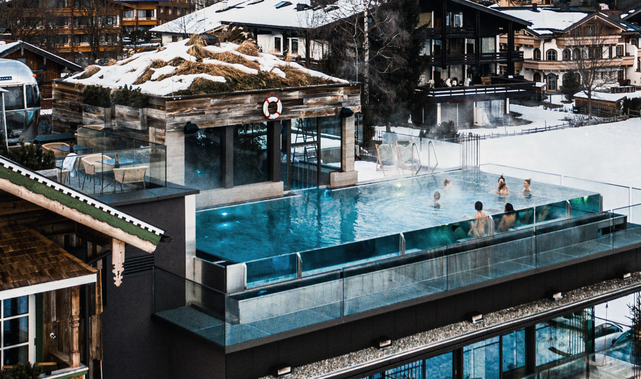 Das Hotel ist von oben bis unten durchgestylt, mit super gemütlichen Zimmern und es bietet euch einen großen Aufenthaltsbereich mit Bar und Lounge. Das Highlight ist der 150 m² große Wellness- und Spabereich im Dachgeschoss und auf dem Dach. Hier findet ihr einen als Ruheraum umgebauten Airstream-Bus, einen beheizten Infinitypool mit Blick auf die Bergkulisse, Bio- und Kräutersauna sowie einen Atrium-Ruheraum mit Bäumen. Massagen und Beautyanwendungen sind gegen Aufpreis vor Ort möglich. Pro Aufenthalt und Zimmer ist ein Wellnessgutschein im Wert von 10,- € enthalten. Mit der Hochkönig Card, die im Reisepreis inkludiert ist, könnt ihr außerdem einmal kostenlos am Nachtskifahren teilnehmen, die Langlaufloipen kostenlos nutzen u.v.m.