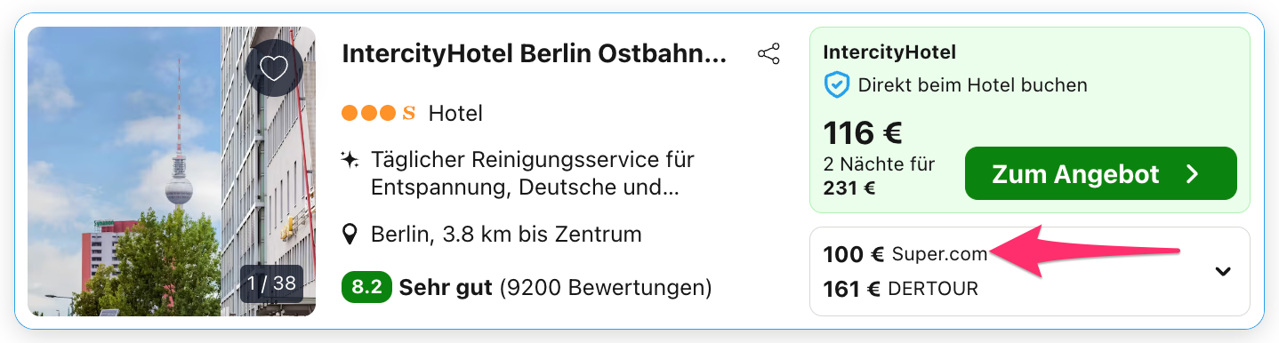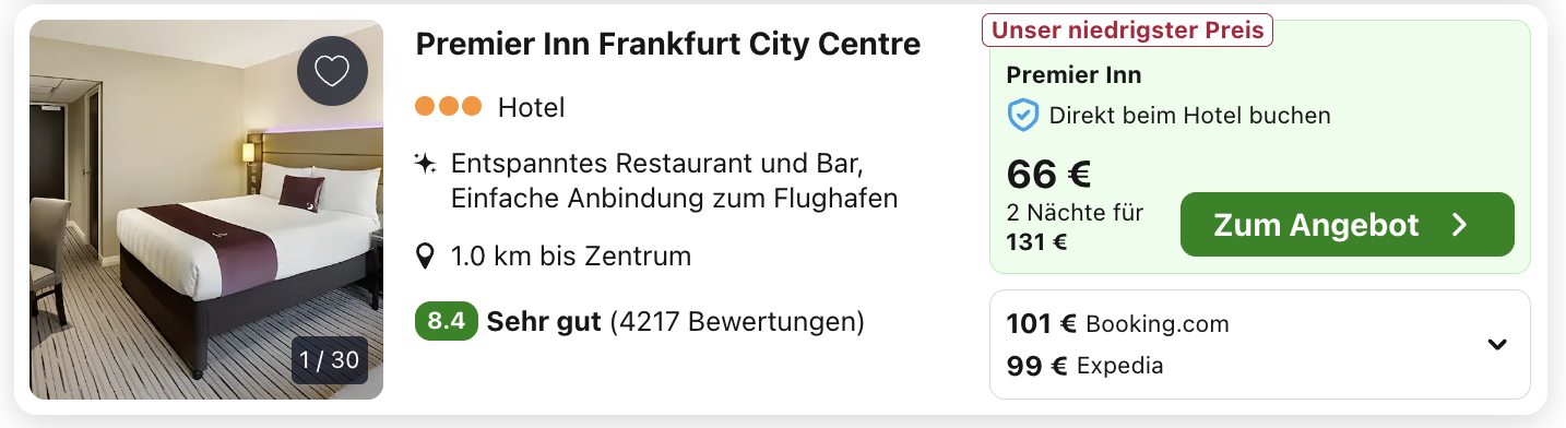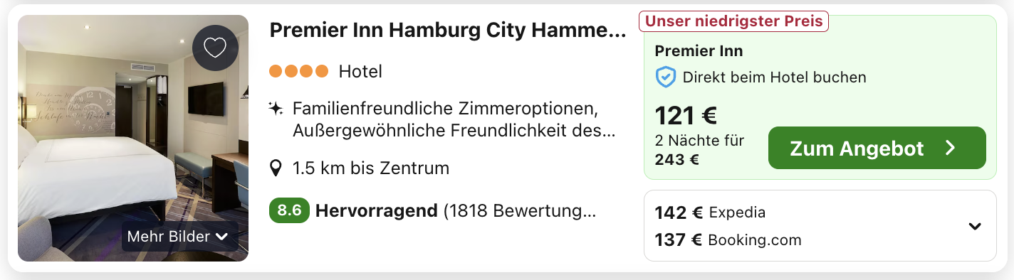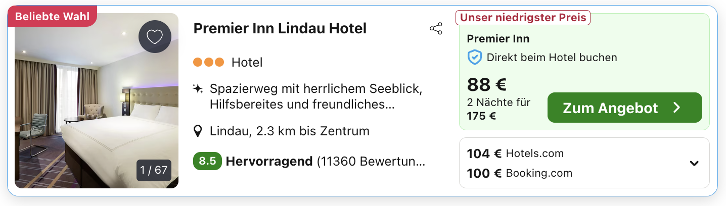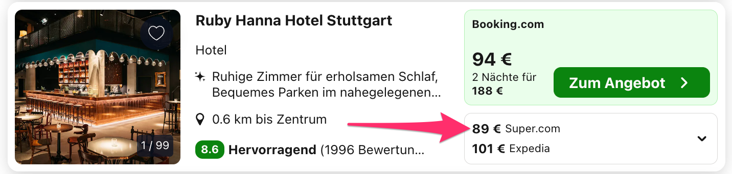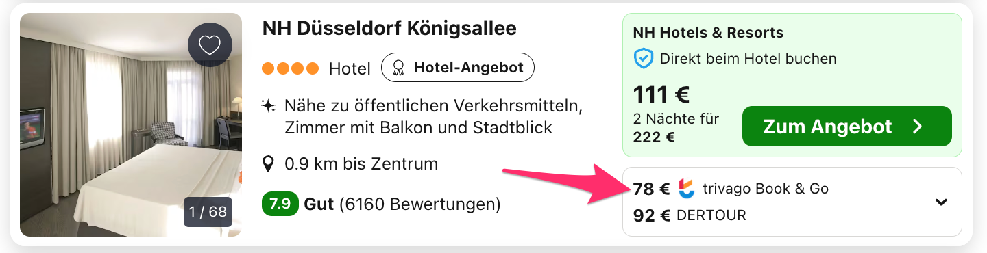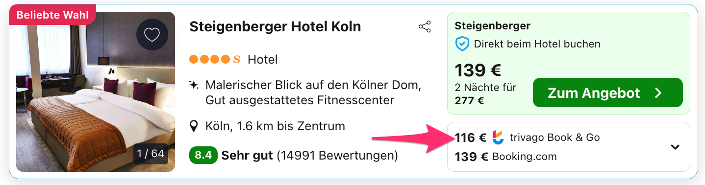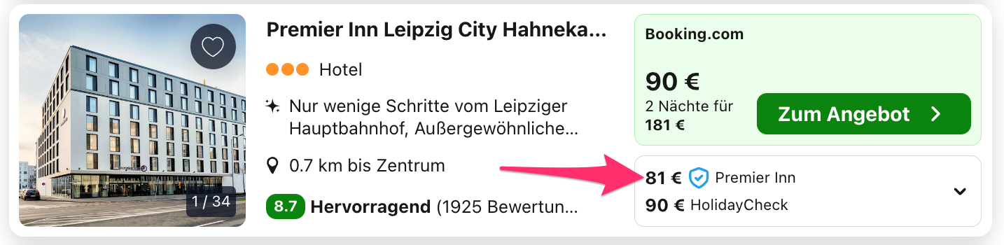 Trivago ist eine Preissuchmaschine und vergleicht alle Preise auf dem Markt, daher kann es sein, dass euch ein anderer Preis bzw. auch ein anderer Veranstalter angezeigt wird, nachdem ihr euch weiterleiten lassen habt. Denn überlegt mal, wie viele Zimmer ein Hotel zum günstigsten Preis hat und wie viel tausend User durch uns innerhalb von kurzer Zeit darauf zugreifen können bzw. buchen. Daher heißt der beste Tipp schnell sein, gerade wenn es sich um kleinere Hotels oder gar Ferienwohnungen handelt, die Ruck Zuck ausgebucht sind.