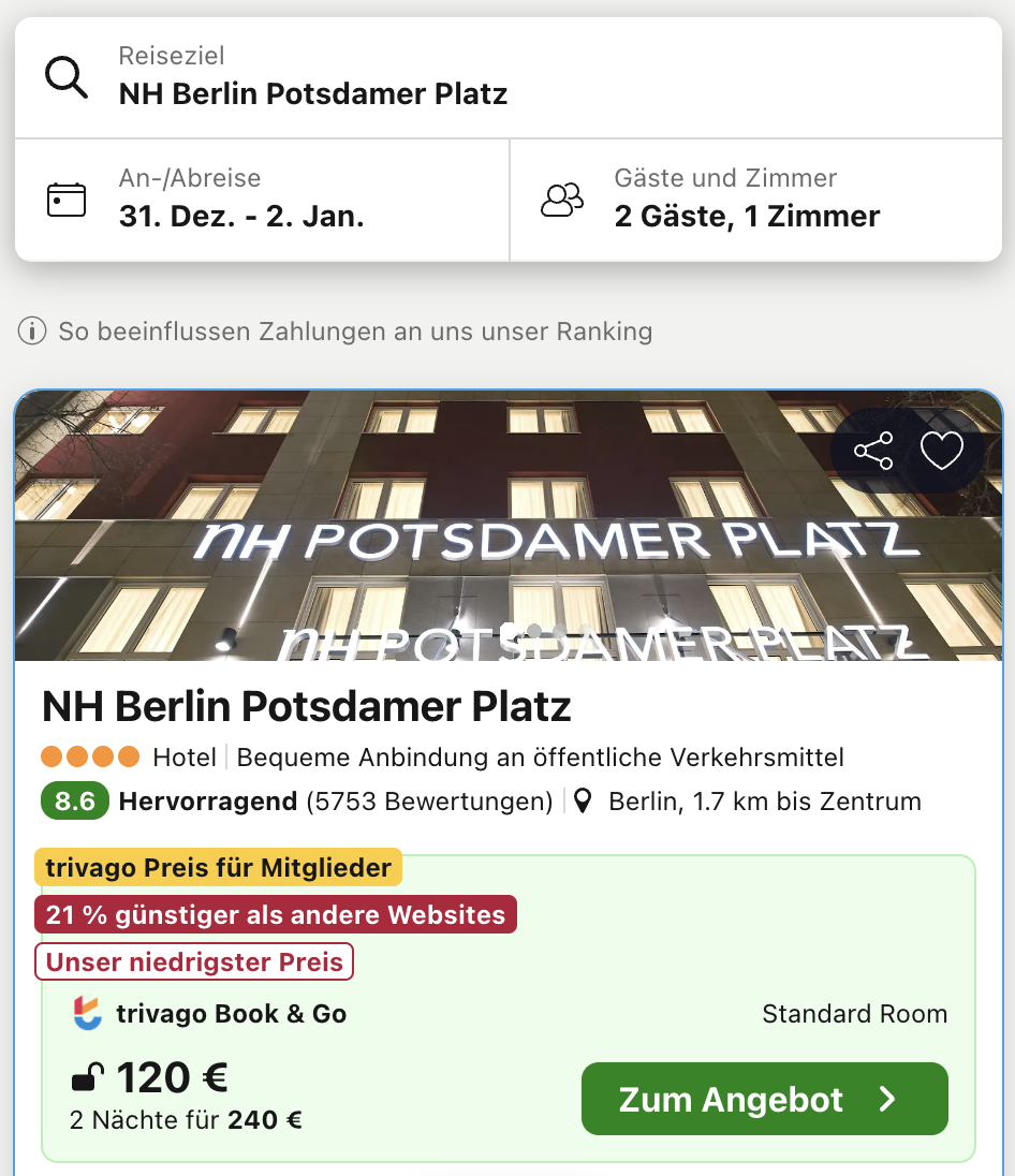 Den günstigsten Preis bekommt ihr direkt bei trivago Book & Go. Wenn euch der Preis nicht direkt angezeigt wird, müsst ihr euch nur kostenlos mit eurer E-Mail-Adresse anmelden.