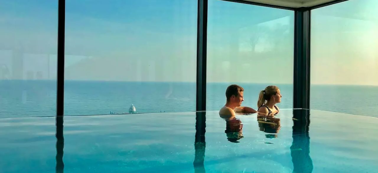 Im Dachgeschoss findet ihr eine Wellness-Oase mit Sauna-Landschaft und Indoor Infinity Swimmingpool mit Panoramablick auf das Meer. Einen weiteren solarbeheizten Außenpool (saisonal) findet ihr draußen.