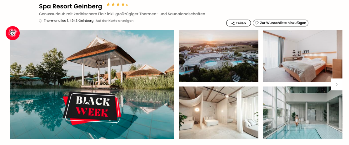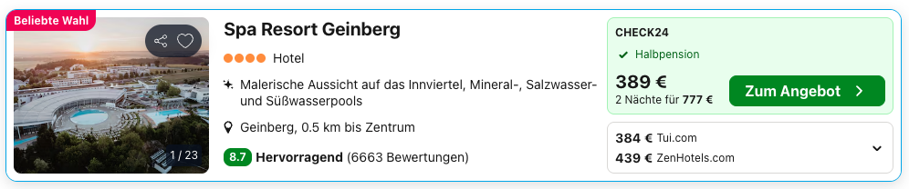 Travelcircus hat genau für diese Therme gerade einen tollen Deal: Ihr bekommt nicht nur den Thermeneintritt, sondern auch die Übernachtung im 4*S Spa Resort Geinberg und die Halbpension 🥙, bezahlt dafür im Gegenzug aber nur ab 124€ pro Person.