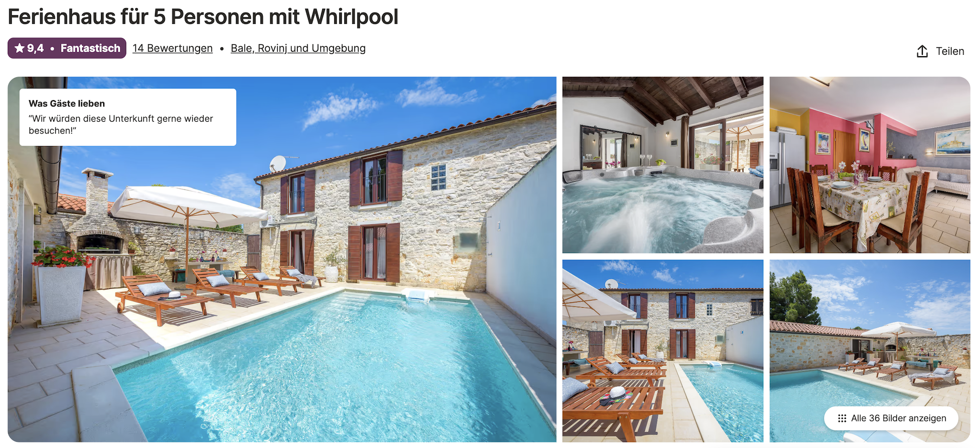 Hier findet ihr weitere Unterkünfte!ZUR SUCHEAhoi Pirates! Dieses zweistöckige Steinhaus in Bale in Kroatien sieht nicht nur von Außen cool aus, sondern kommt auch noch mit dem nötigen Wellnessfaktor daher. Euch erwarten ein Pool, ein Whirlpool und eine Sauna 🔥