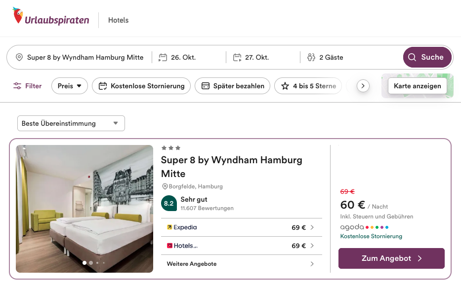 Bei diesem übernachtet ihr im guten 3* Super 8 by Wyndham Hamburg Mitte und zahlt im Gegenzug gerade einmal 30€ pro Person bei einer Reise zu zweit.