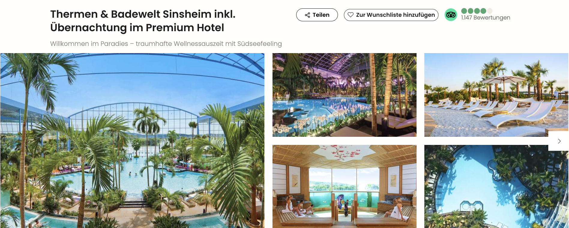 Bei Travelcircus gibt es gerade einen guten Deal, bei dem ihr in einem Hotel in Umgebung der Therme übernachtet, das Frühstück mit dabei habt und ganztags Zutritt in das Palmenparadies ab 79 € pro Person erhaltet. Gegen Aufpreis könnt ihr auch die Vitaltherme und Sauna besuchen sowie auch direkt Tickets für mehrere Tage buchen. Der Vorteil des Angebots: Ihr bucht Ticket + Hotel mit einem Klick und spart Zeit bei der Hotelsuche.