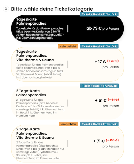 Zur Wahl stehen die Kategorien Tageskarte sowie 2- und 3-Tageskarten für das Palmenparadies plus Vitaltherme & Sauna, bei denen der Zutritt ab 16 Jahren erlaubt ist. Kinder bis 4 Jahre erhalten freien Eintritt in das Palmenparadies.