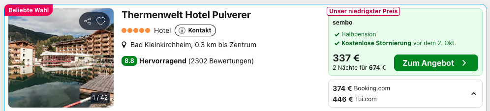 Woanders kostet euch der Beispieltermin mit Anreise am 26. Oktober mindestens 337€ pro Person inklusive Halbpension, bei uns hingegen nur 199€ inklusive Verwöhnpension. Dementsprechend habt ihr eine Ersparnis von mehr als 40%!