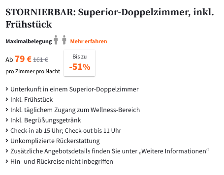 Wir haben mal die Preise auf anderen Buchungsportalen gecheckt und können eine top Ersparnis für euch feststellen, wie zum Beispiel noch an einem Wochenende im Oktober. Hier würdet ihr für dieselbe Zimmerkategorie bei Booking mindestens 306€ gesamt für das Wochenende zahlen. Bei Secret Escapes sind es nur 158€. Somit entspricht das einer Ersparnis von über 48%!!